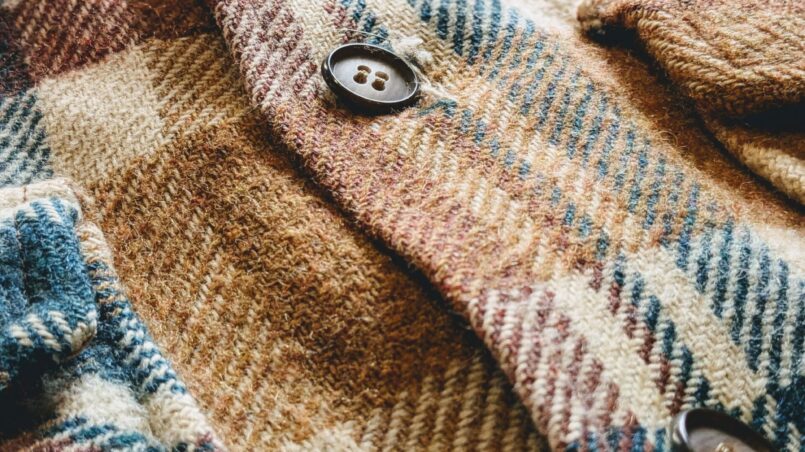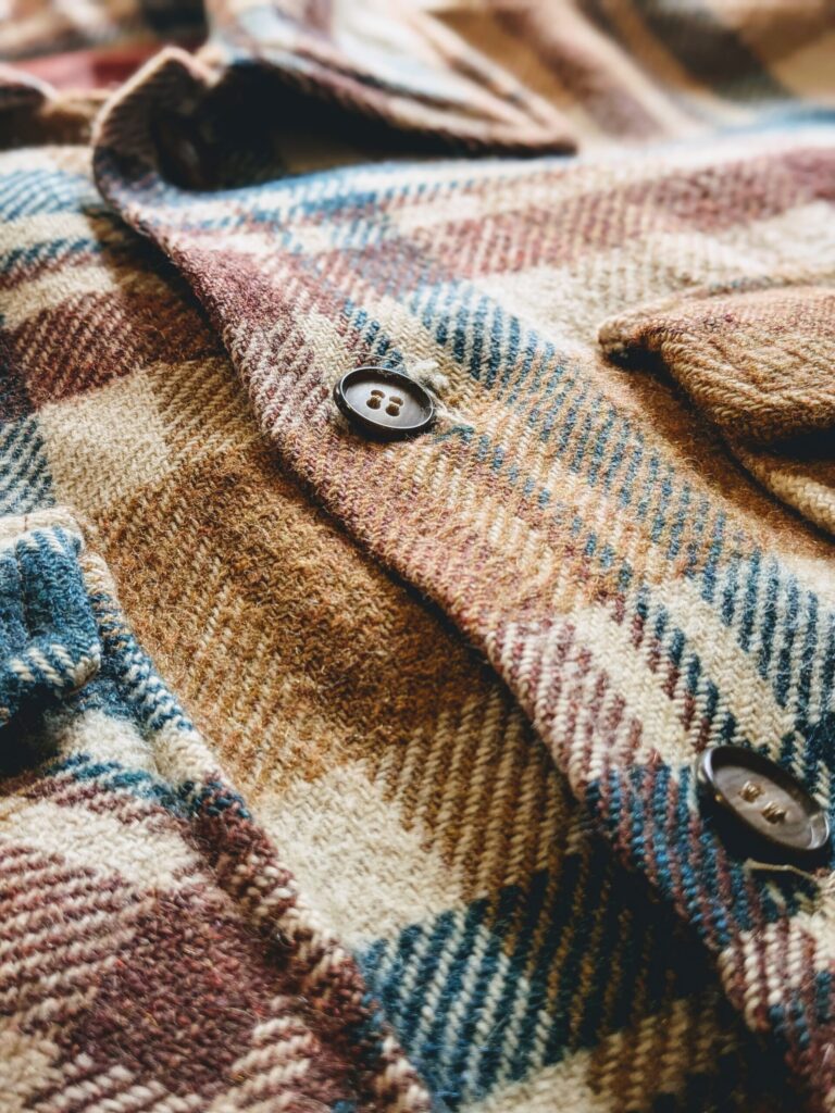 ボディは程よい厚みのあるウール生地、ベージュとブラウン、グリーンのチェック柄です。