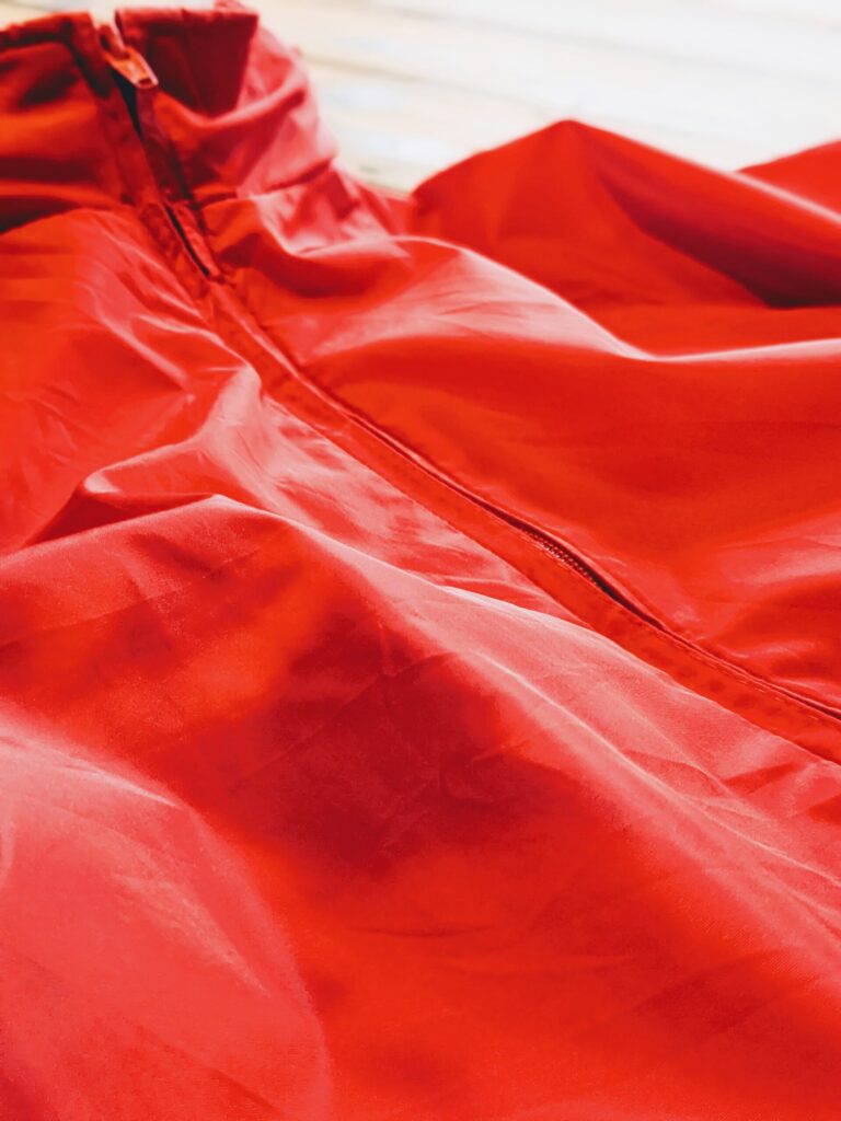 カラーはレッド、ボディはサラサラとしたナイロン生地で軽い着心地。