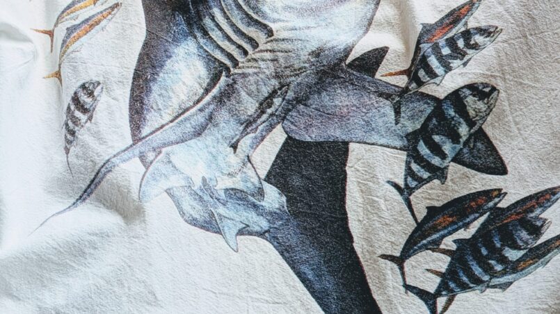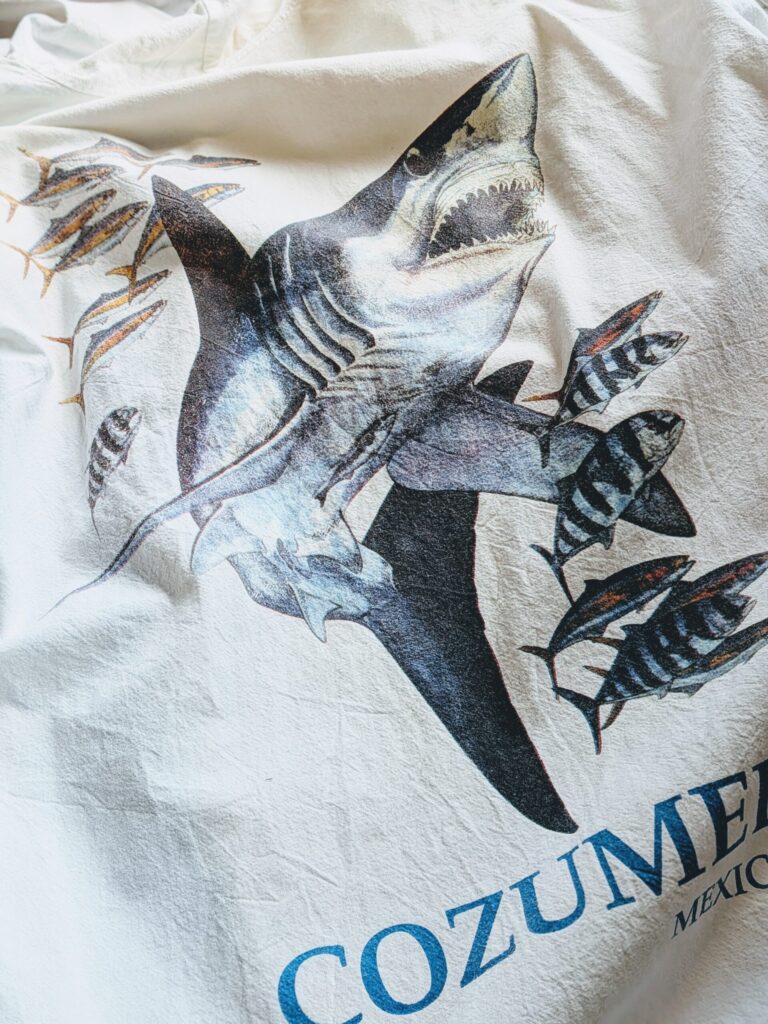 カラーはホワイト、バックには大きくサメのプリント。