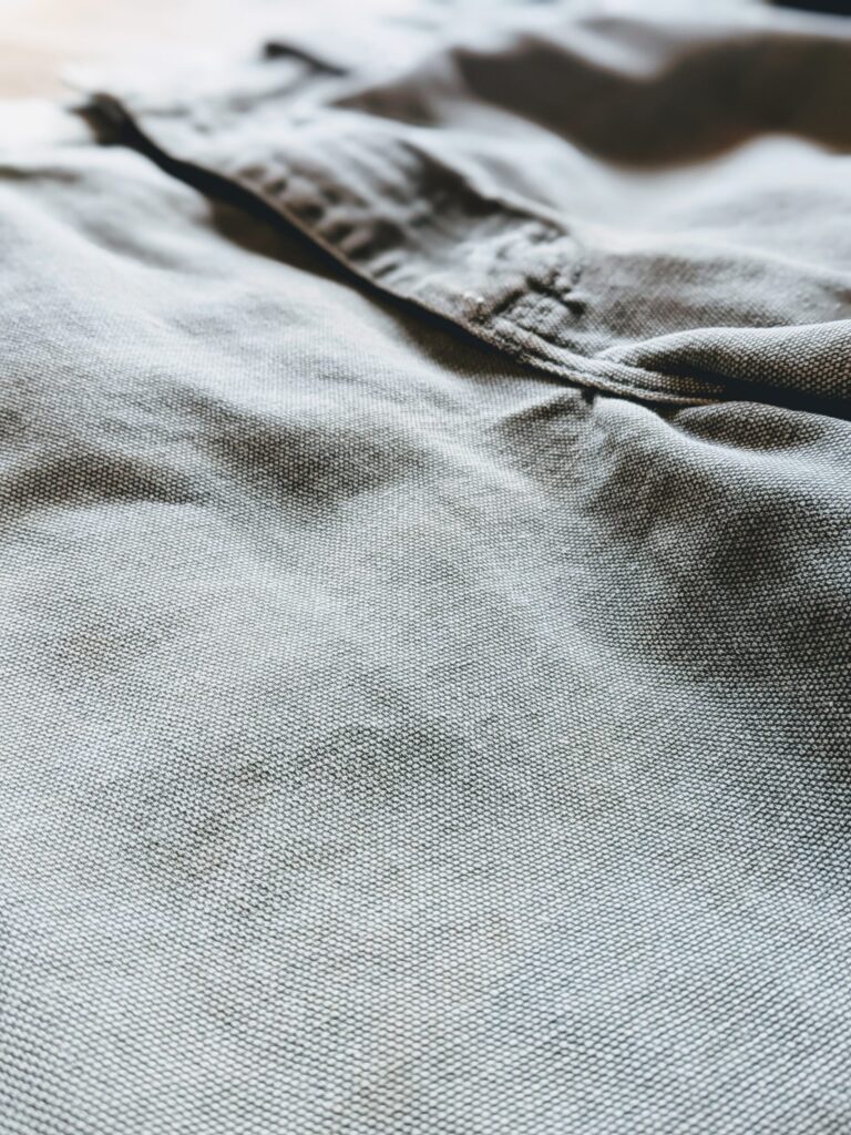 カラーはカーキ、程よい厚みのあるしっかりとした生地感です。