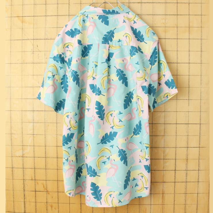 USA party pants フラミンゴ 総柄 半袖 アロハ シャツ ライトブルー メンズXL ハワイアン アメリカ古着