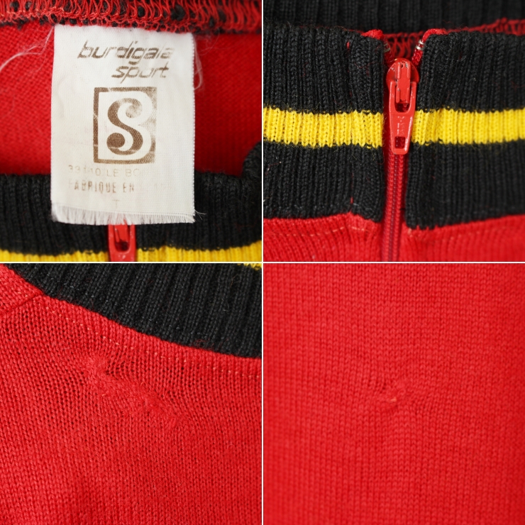 70s 80s FRANCE burdigala sport 半袖サイクリングジャージ シャツ プルオーバー レッド イエロー メンズSM相当 ニット ヨーロッパ古着です。