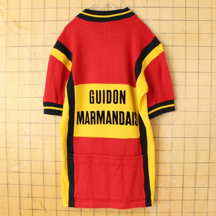 70s 80s FRANCE burdigala sport 半袖サイクリングジャージ シャツ プルオーバー レッド イエロー メンズSM相当 ニット ヨーロッパ古着