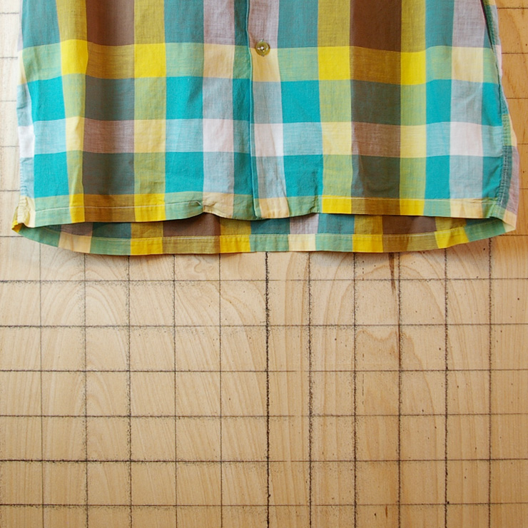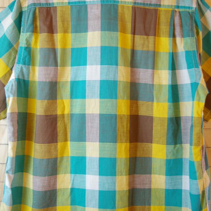 【Marlboro Sportswear】USA製古着イエロー×グリーン×ブラウン(黄×緑×茶)マドラスチェック丸襟半袖シャツ|メンズLサイズ|リメイクです。
