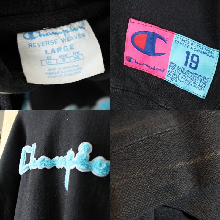 00s USA champion チャンピオン ロゴワッペン リバースウィーブスウェットパーカー フーディー ブラック メンズL アメリカ古着です。