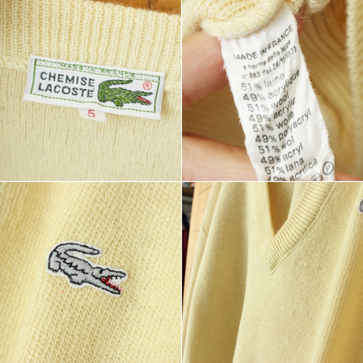 70s 80s フランス製フレンチラコステ LACOSTE ウールニットVネックセーター イエロー メンズL相当 ヨーロッパ古着です。