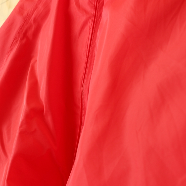 カラーはレッド、ボディはサラサラとしたナイロン生地で軽い着心地。