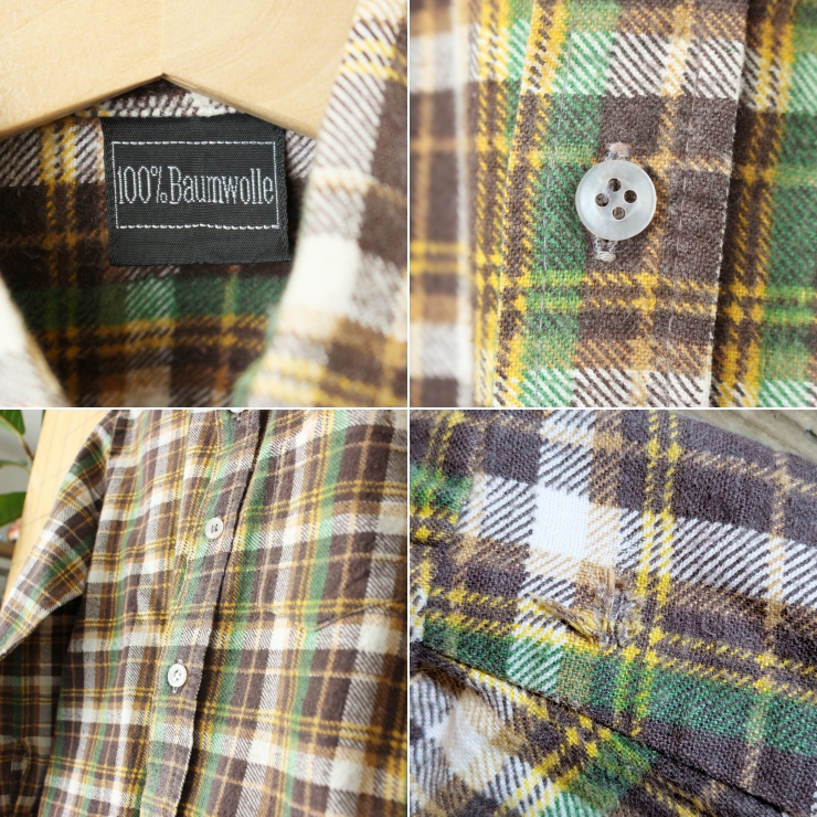 70s 80s EURO キッズ コットンプリントチェックシャツ 140cm相当 ブラウン グリーン ヨーロッパ古着です。