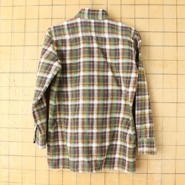 70s 80s EURO キッズ コットンプリントチェックシャツ 140cm相当 ブラウン グリーン ヨーロッパ古着