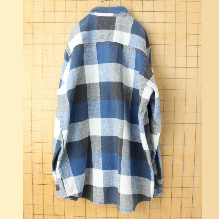 80s 90s USA ヘビーフランネル ブロックチェックシャツ ブルー ブラック メンズXL相当 長袖 アメリカ古着
