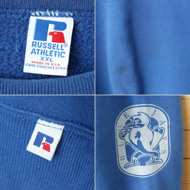 ビッグサイズ 90s USA製 RUSSELL ATHLETIC BLUE JAY BASEBALL 両面プリントスウェット ブルー メンズXXL アメリカ古着です。