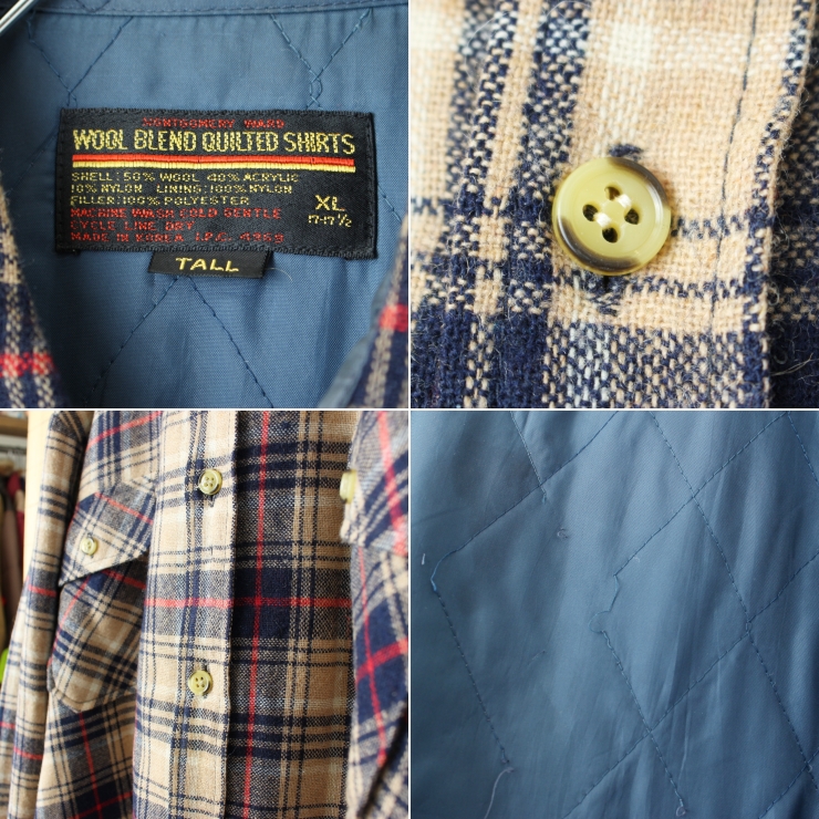 ビッグサイズ 80s 90s USA MONTGOMERY WARD キルティングライナー チェックウールシャツ ベージュ メンズXL 長袖 中綿 アメリカ古着です。
