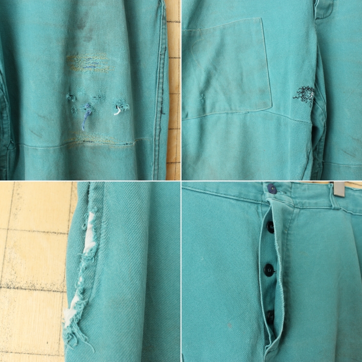 風合い豊かにリペアされた、60年代から70年代頃のユーロヴィンテージのワークパンツ。
