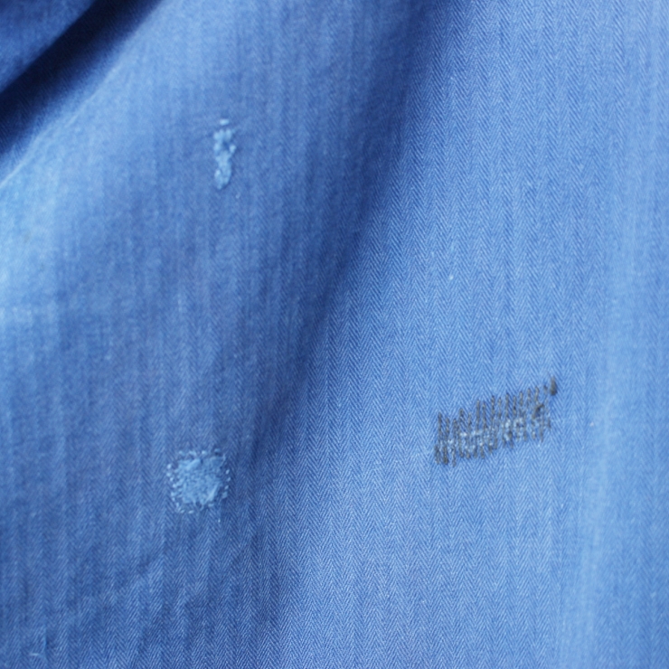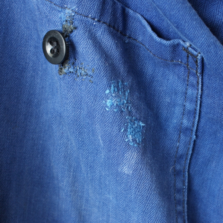 カラーはヘリンボーンツイル独特の風合い良く色落ちしたネイビー。程よい厚みのある柔らかい生地感です。