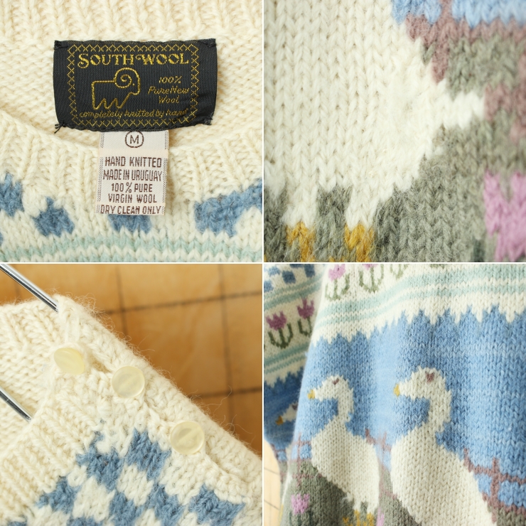 80s 90s ウルグアイ製 SOUTH WOOL ハンドメイド ウールニットベスト レディースM アヒル柄 オフホワイト アメリカ古着です。
