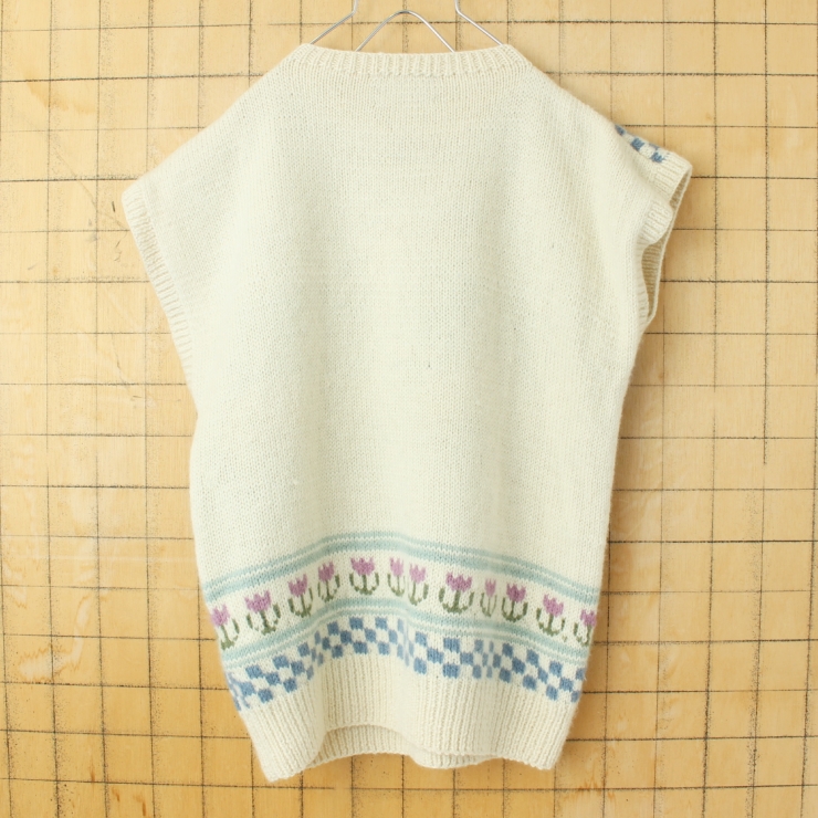 80s 90s ウルグアイ製 SOUTH WOOL ハンドメイド ウールニットベスト レディースM アヒル柄 オフホワイト アメリカ古着