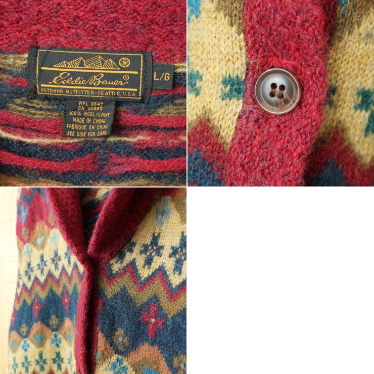 90s USA Eddie Bauer エディーバウアー 総柄ショールカラー ウールニット前開きベスト レディースL アメリカ古着です。