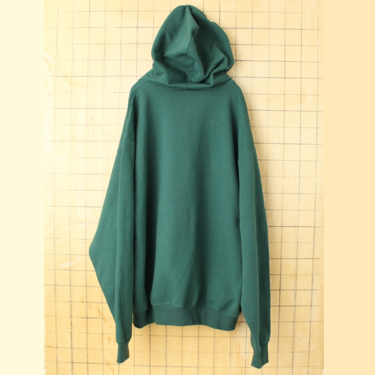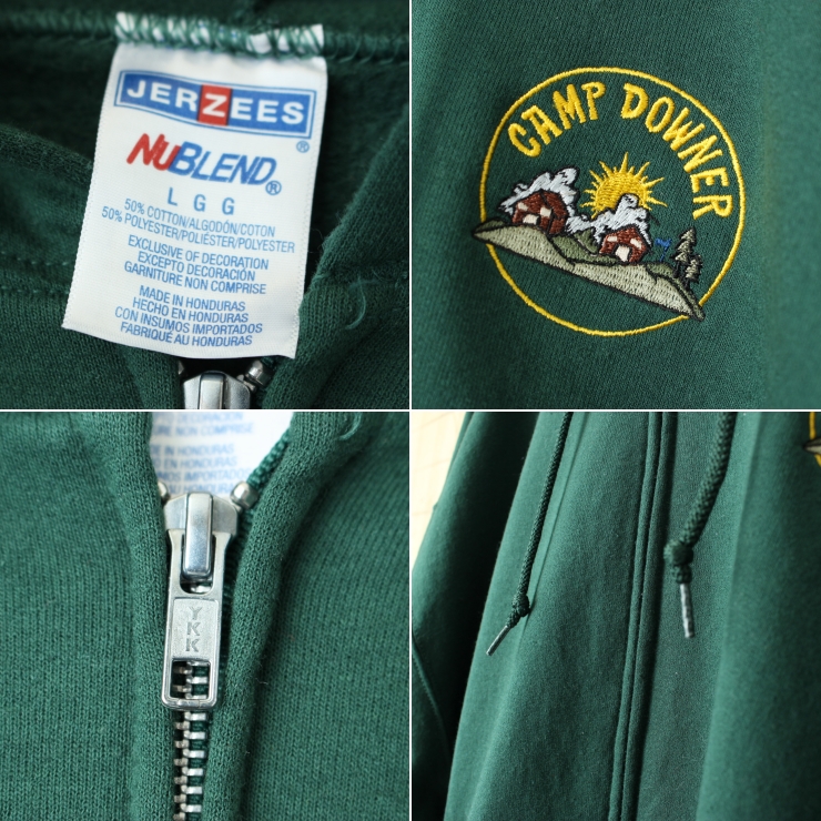 USA JERZEES CAMP DOWNER ジップアップスウェットパーカー グリーン メンズL フーディー 刺繍 アメリカ古着です。