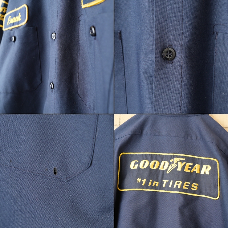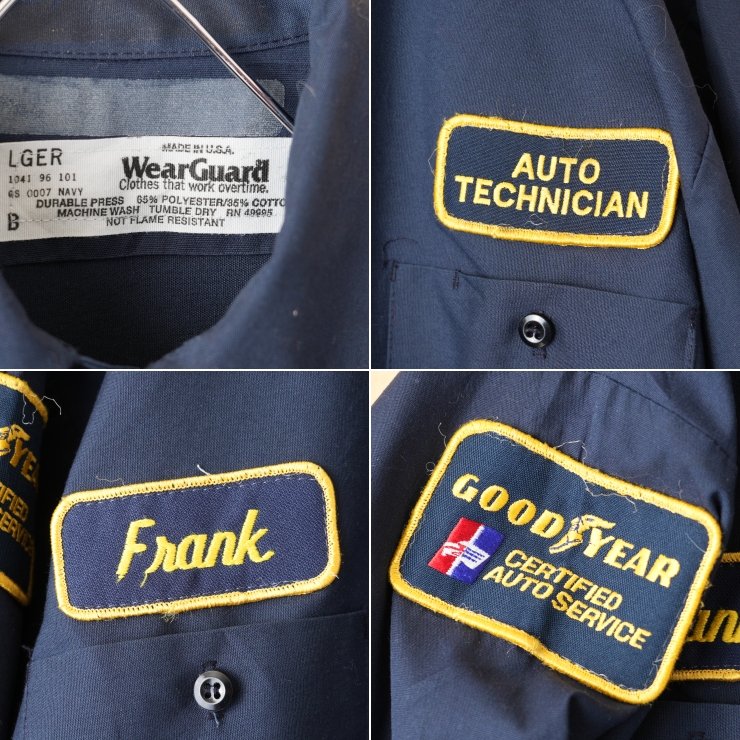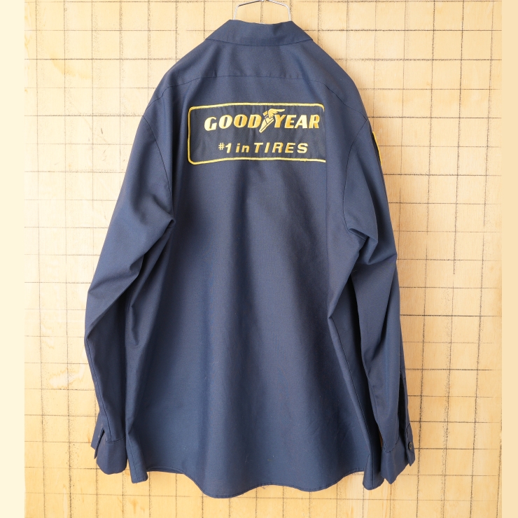 80s 90s USA製 WearGuard GOODYEAR ワークシャツ ネイビー ブルー メンズL 長袖 ワッペン アメリカ古着です。