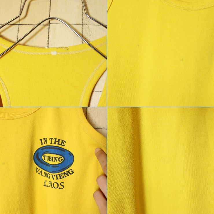USA製 古着 両面プリント タンクトップ IN THE TUBING VANG VIENG LAOS イエロー メンズS相当 アメリカ古着です。