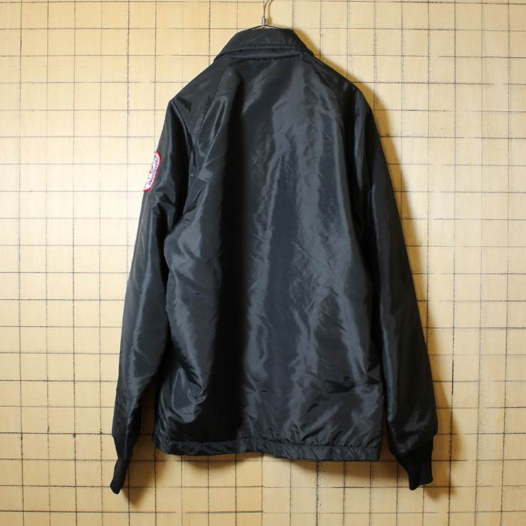 70s USA製 Pla-Jac 古着 ナイロン 裏ボア コーチジャケット ブラック 黒 メンズS レタードワッペン ラグランです。