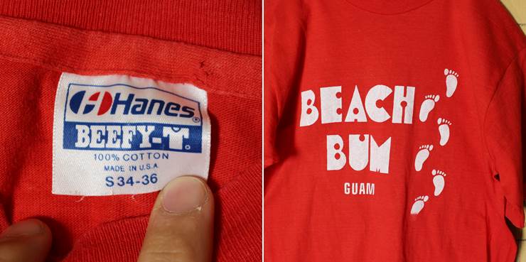 USA製 Hanes BEACH BUM GUAM プリント Tシャツ 半袖 レッド メンズS ヘインズ 古着です。