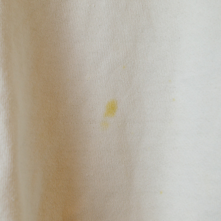 腹部、わき腹、背面、裾リブ、袖にシミがあります。