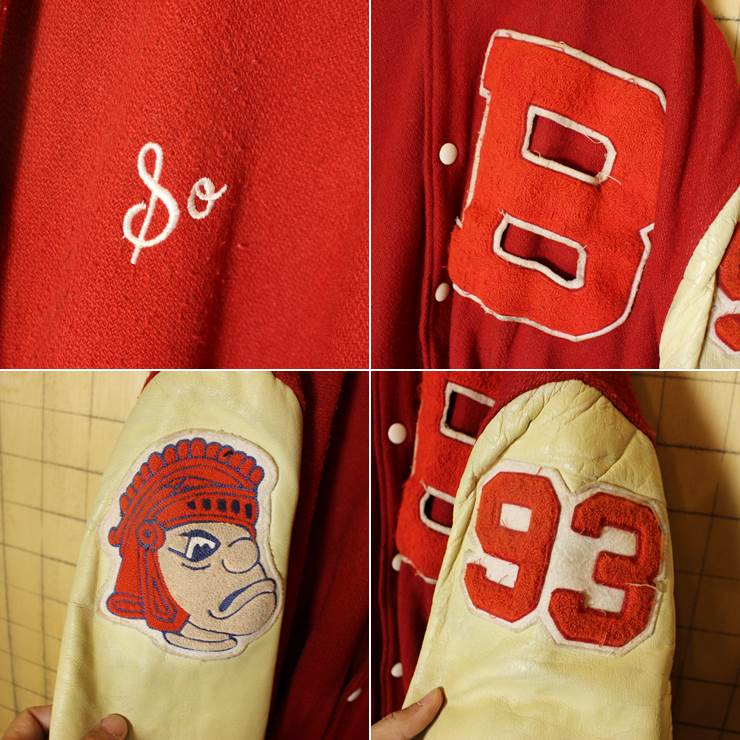 風合いのあるレッドカラーです。胸にBのワッペン、両袖と背面にもワッペンが取り付けられています。