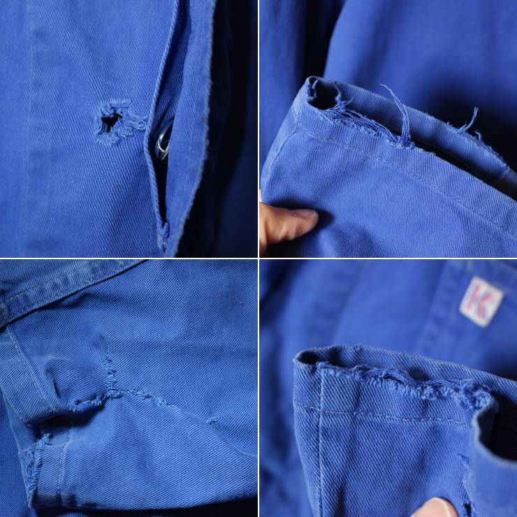 前開きのボタン付近2箇所にダメージ、左袖口にリペア跡があります。その他各所にオイル染み、擦れ、ほつれ等があります。