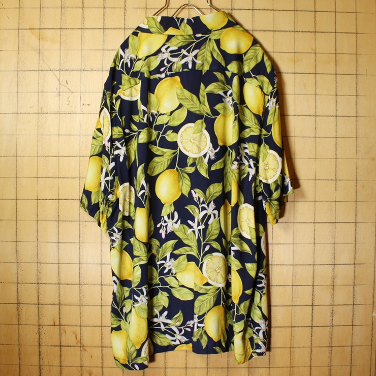 H&M レモン柄 ハワイアン レーヨン シャツ メンズL ネイビー 青 アロハ 半袖 アメリカ古着