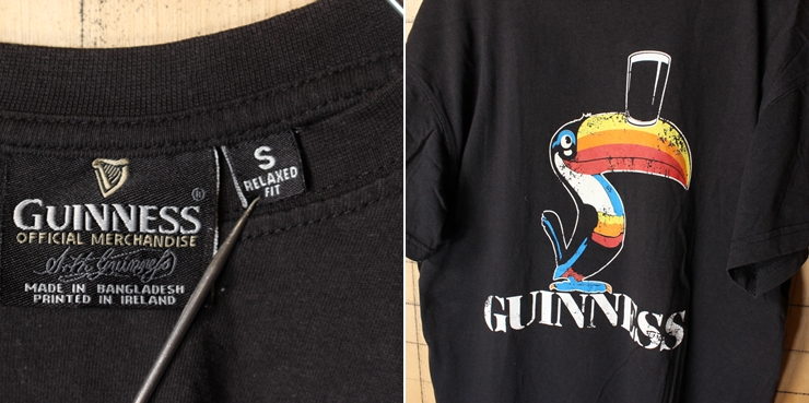 カラーはブラック、フロントにギネスビールのマスコット、トゥーカンのプリントデザインです。