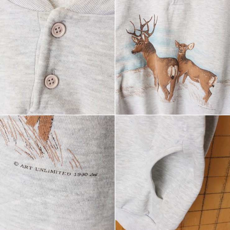 90s USA製 カモシカ 両面 プリント スウェット グレー メンズXL相当 ヘンリーネック ポケット付 アメリカ古着です。