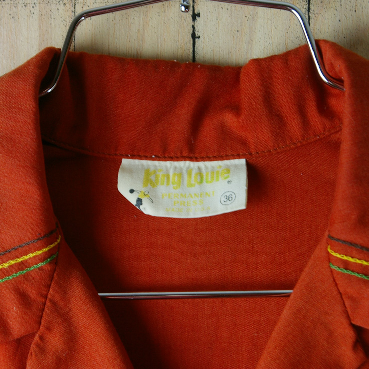古着USA製メンズ半袖オレンジ(赤茶)チェーンステッチビンテージボーリングシャツ【King Louie(キングルイ)】です。
