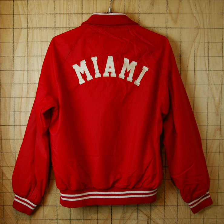 【Champion】USA製古着レッド(赤)MIAMIスナップボタンスタジャン・ナイロンジャケット|メンズSサイズです。