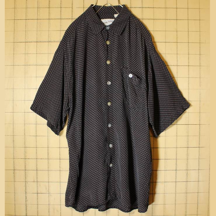 80s 総柄 半袖 シルク シャツ ブラック メンズXL相当…