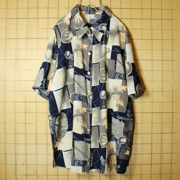 80s 幾何学模様 総柄 半袖 シルク シャツ ブラック メ…