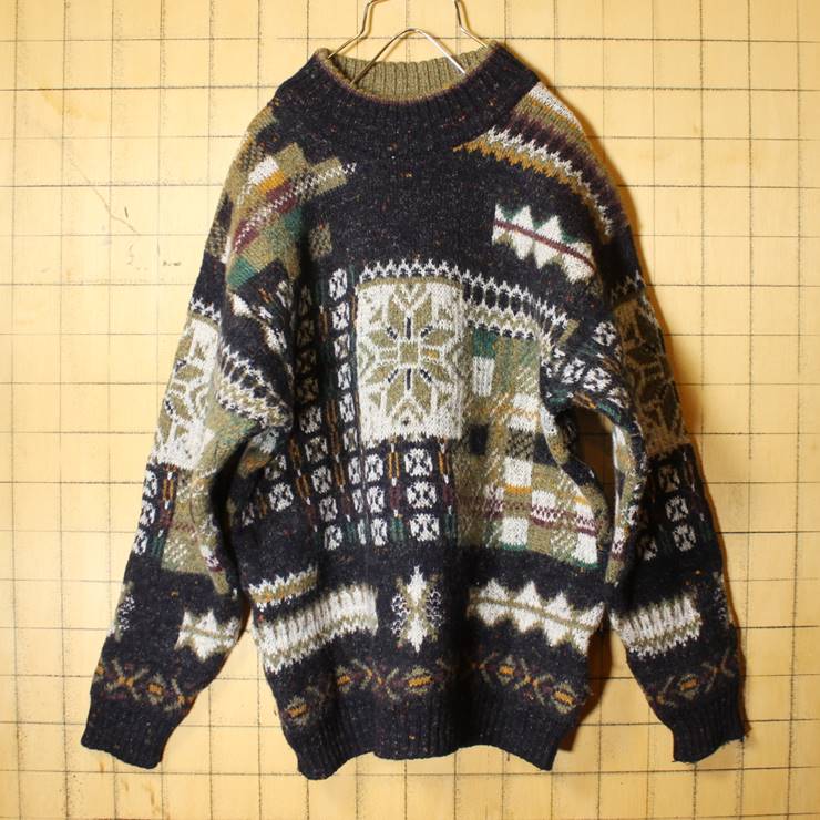 古着ウールリッチウール100%総柄ブラック(黒)ニットセータ…